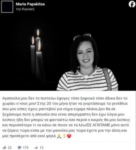 Συγκεκριμένα, η αδελφή της 34χρονης ανέφερε: «Αγαπούλα μου δεν το πιστεύω έφυγες τόσο ξαφνικά τόσο άδικα δεν το χωράει ο νους μου! Στις 20 του μήνα ήταν να γιορτάσουμε τα γενέθλια σου μου είπες έχεις ραντεβού για νύχια είχαμε πλάνα. Δεν θα σε ξεχάσουμε ποτέ η απουσία σου είναι απερίγραπτη δεν έχω λόγια μου λείπεις ήδη δεν μπορώ να φανταστώ όσο περνά ο καιρός θα μου λείπεις και περισσότερο τι να κάνω σε ποιον να τα λέω! Σε αγαπάμε μόνο αυτό να ξέρεις τώρα είσαι με την μανούλα μας τώρα έχετε μια την άλλη και μας προσέχετε από εκεί ψηλά».