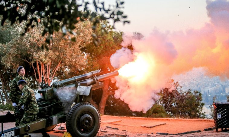- Ο πρώτος κανονιοβολισμός έπεσε στις 6:47 το πρωί. Ακολούθησαν 21 κανονιοβολισμοί, όπως προβλέπει το πρωτόκολλο, από το πυροβολείο του Λυκαβηττού ανήμερα της εθνικής επετείου.