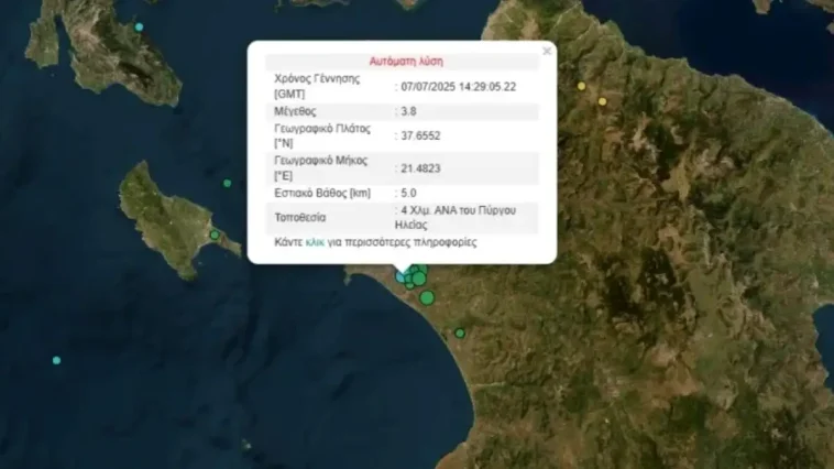Σεισμός σημειώθηκε το απόγευμα της Δευτέρας (07.07.2025) στον Πύργο Ηλείας.