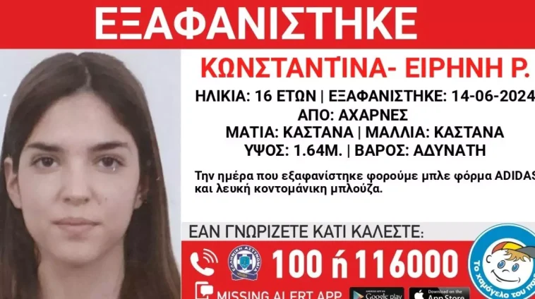 Σύμφωνα με ανακοίνωση από το «Χαμόγελο του Παιδιού», τα ίχνη της 16χρονης χάθηκαν την Παρασκευή (14.06.2024) από την περιοχή των Αχαρνών.