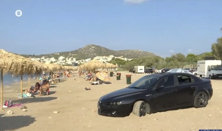 Την ίδια ώρα, η κάμερα του ΣΚΑΪ κατέγραψε ένα αδιανόητο σκηνικό, καθώς ένα αυτοκίνητο φαίνεται να είναι σταθμευμένο λίγα μέτρα από τις ομπρέλες σε παραλία της Αττικής.