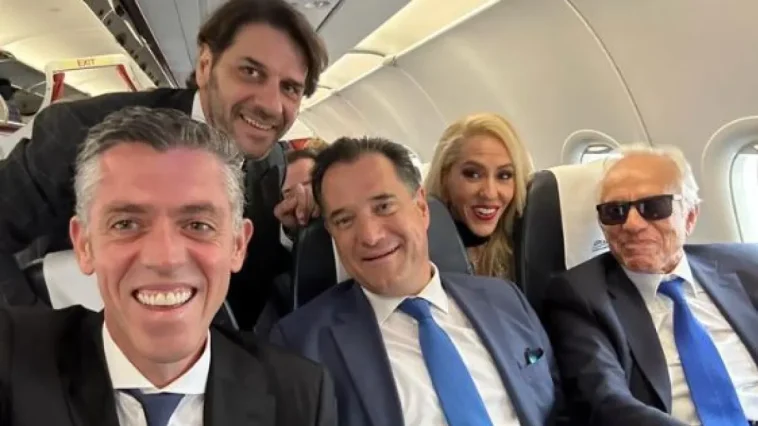 Να ποζάρει χαμολαστός και πλαισιωμένος από μέλη της οικογένειας Κοπελούζου φωτογραφήθηκε σήμερα ο Άδωνις Γεωργιάδης, κατά τη διάρκεια της πτήσης του με προορισμό το Κουβέιτ.