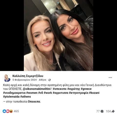- Ωστόσο, τις τελευταίες ημέρες στα Μέσα Κοινωνικής Δικτύωσης, δημοσιεύσεις της Καλλιόπης…εξαφανίζονται μυστηριωδώς. Ανάμεσά τους, μια πολύ ενδιαφέρουσα και viral: η selfie της με την πρώην Γενική Διευθύντρια του ΟΠΕΚΕΠΕ και πρώην μέλος του Διοικητικού του Συμβουλίου Μελιτίνη Οικονομάκη.