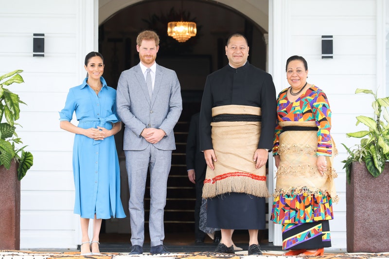 Ο βασιλιάς Tupou VI της Τόνγκα, που απεικονίζεται με τον Δούκα και τη Δούκισσα του Sussex στη βασιλική τους περιοδεία το 2018, παρευρέθηκε και στην κηδεία της βασίλισσας χωρίς τη σύζυγό του, βασίλισσα Nanasipau’u Tuku’aho.