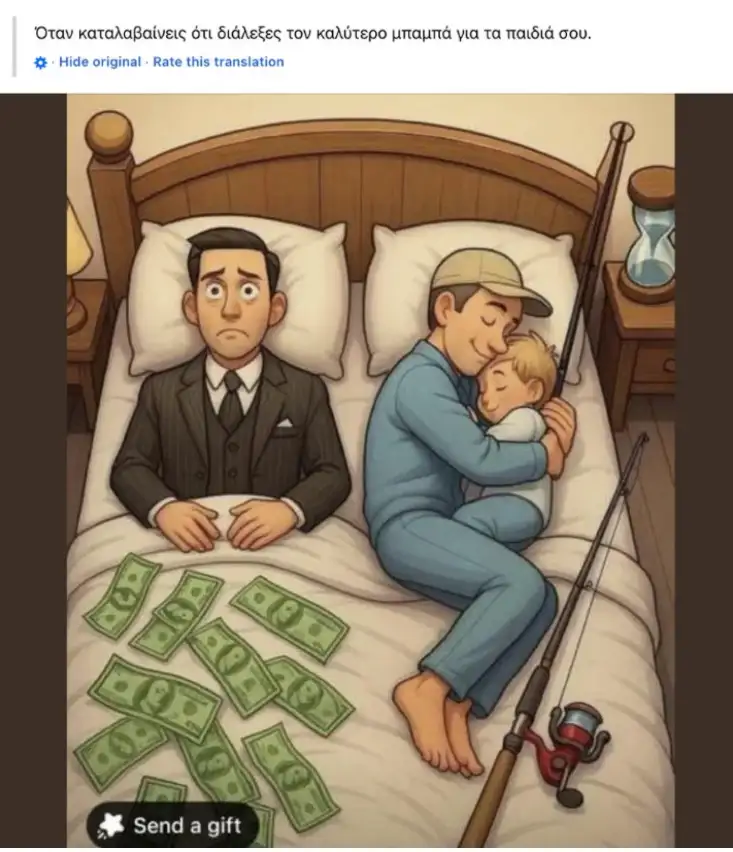 Η εικόνα, απεικονίζει δυο άνδρες να είναι ξαπλωμένοι στο ίδιο κρεβάτι – ο ένας κοστουμαρισμένος, δείχνει θλιμμένος, έχει πάνω από τα σκεπάσματα πολλά χαρτονομίσματα, ο άλλος στα δεξιά κρατά στην αγκαλιά του ένα παιδί και ντυμένος σαφώς πιο «φτωχικά» αλλά πιο ευτυχισμένος.