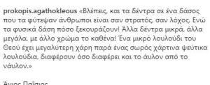 «Βλέπεις, και τα δέντρα σε ένα δάσος που τα φύτεψαν άνθρωποι είναι σαν στρατός, σαν λόχος. Ενώ τα φυσικά δάση πόσο ξεκουράζουν! Άλλα δέντρα μικρά, άλλα μεγάλα, με άλλο χρώμα το καθένα! Ένα μικρό λουλούδι του Θεού έχει μεγαλύτερη χάρη παρά ένας σωρός χάρτινα ψεύτικα λουλούδια, διαφέρουν όσο διαφέρει και το άυλον από το νάυλον. Άγιος Παΐσιος»