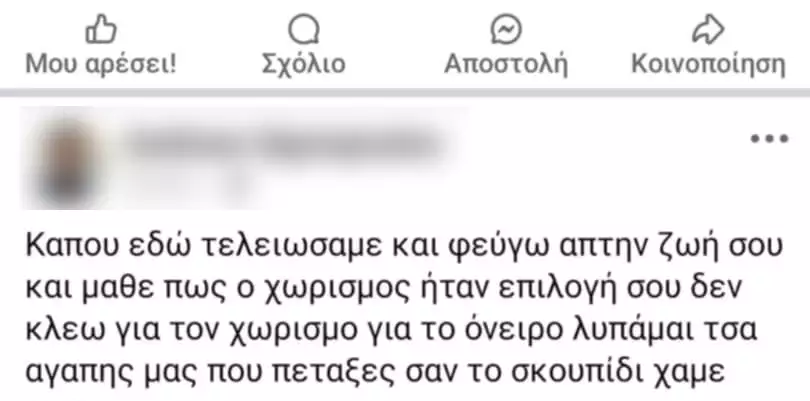 «Κάπου εδώ τελειώσαμε και φεύγω απ’ την ζωή σου και μάθε πως ο χωρισμός ήταν επιλογή σου. Δεν κλαίω για τον χωρισμό για το όνειρο λυπάμαι τσα αγάπης μας που πέταξες σαν το σκουπίδι χάμε», αναφέρει σε μία εξ αυτών ενώ σε άλλη κάνει αναφορές για «την ημέρα του θανάτου του».