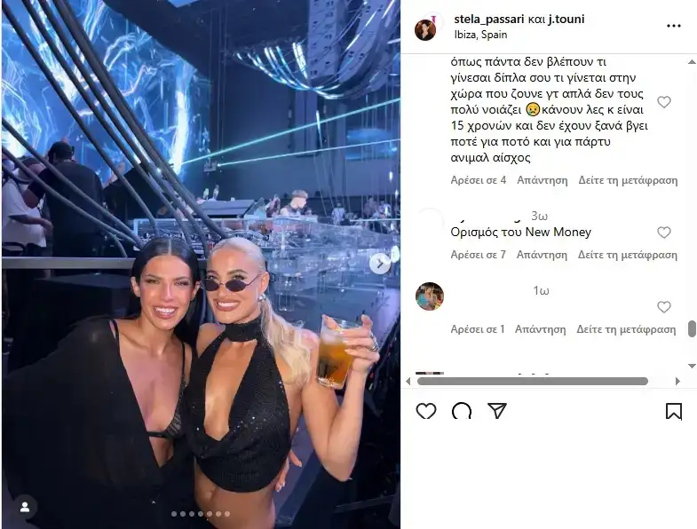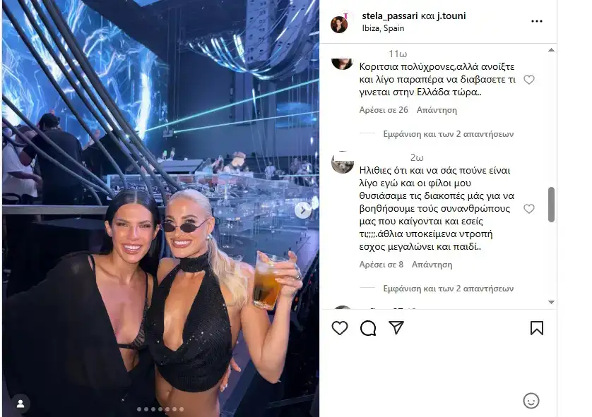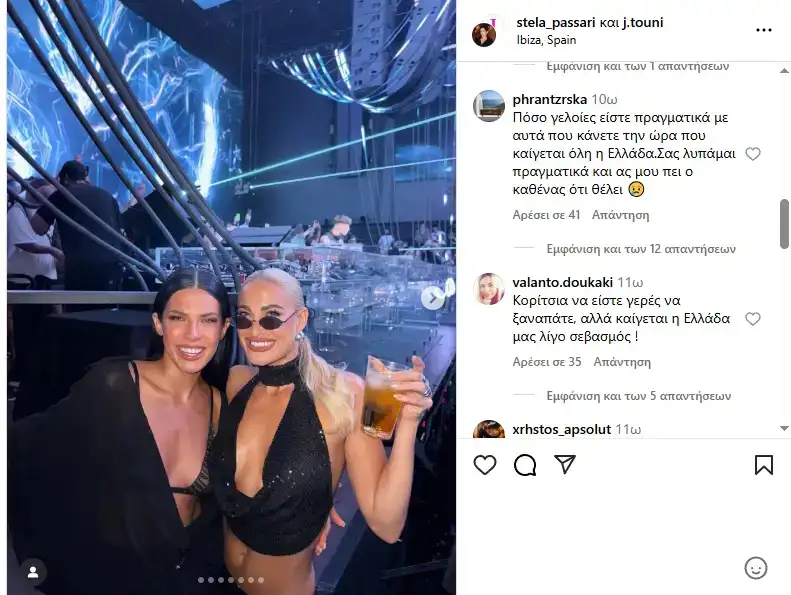 Μηνύματα οργής και αποδοκιμασίας προκάλεσε η νέα ανάρτηση της Στέλλας Πάσσαρη, στην οποία ποζάρει μαζί με την Ιωάννα Τούνη σε ένα πάρτι στην Ίμπιζα. Οι εν λόγω φωτογραφίες ανέβηκαν στο Instagram, τη στιγμή που η χώρα μας ήταν στο έλεος της πύρινης λαίλαπας, γεγονός που δεν άρεσε καθόλου στους followers τους.