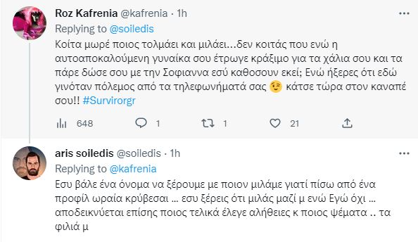•  Όμως ο Άρης Σοιλέδης απαντά, σαν να θέλει να πείσει τον κάθε άγνωστο «Ακόμα πονάς ρε Άρη; Ακόμα να αποδεχτείς ότι ο κόσμος σου γύρισε μαζικά την πλάτη, αηδιασμένος από τον τραγικό χαρακτήρα σου?  Τόσοι μήνες πέρασαν, get over it bro» γράφει ένας χρήστης του τουίτερ με τον ποδοσφαιριστή  να απαντα «Για ποιο λόγο να πονάω ακριβώς παλικάρι μου ?? δεν είσαι καλά αλήθεια να το κοιτάξεις» όμως «καπάκι» έρχεται και το επόμενο σχόλιο «Κοίτα μωρέ ποιος τολμάει και μιλάει…δεν κοιτάς που ενώ η αυτοαποκαλούμενη γυναίκα σου έτρωγε κράξιμο για τα χάλια σου και τα πάρε δώσε σου με την Σοφιαννα εσύ καθόσουν εκεί; Ενώ ήξερες ότι εδώ γινόταν πόλεμος από τα τηλεφωνήματά σας κάτσε τώρα στον καναπέ σου» με τον ίδιο να απαντά και πάλι «Εσυ βάλε ένα όνομα να ξέρουμε με ποιον μιλάμε γιατί πίσω από ένα προφίλ ωραία κρύβεσαι … εσυ ξέρεις ότι μιλάς μαζί μ ενώ Εγώ όχι … αποδεικνύεται επίσης ποιος τελικά έλεγε αλήθειες κ ποιος ψέματα .. τα φιλιά μου» απαντά ενώ στο σχόλιο πως το μόνο που καταφέρνει είναι να φαίνεται ο πικραμένος, αποτυχημένος παίκτης που ένας Θεος ξέρει πόσες παρατυπίες έχει κάνει για να τον  θέλει η παραγωγή, απαντά πως «Αποτυχημένος παίκτης survivor ο παίκτης με τα καλύτερα στατιστικά στην ιστορία του ριάλιτι;» δείτε αναλυτικά παρακάτω όλα τα σχόλια.