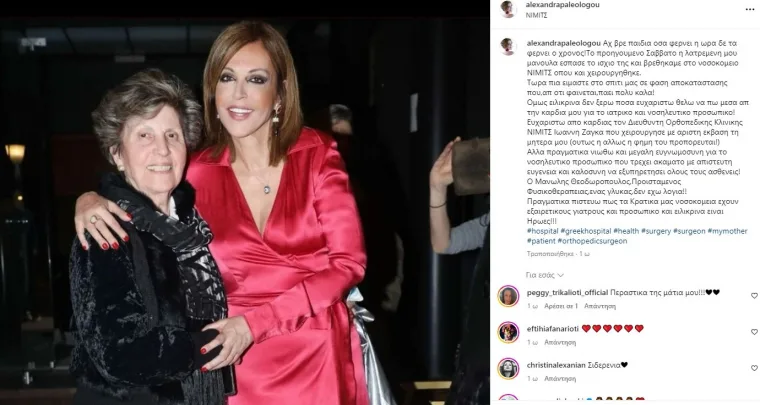 Δύσκολα τα τελευταία 24ωρα για την Αλεξάνδρα Παλαιολόγου που βρέθηκε στο πλευρό της μητέρας της μετά από ατύχημα που είχε και χρειάστηκε να χειρουργηθεί! Συγκεκριμένα, η μητέρα της έσπασε μετά από ατύχημα το ισχίο της και χρειάστηκε να βρεθεί στο νοσοκομείο προκειμένου να υποβληθεί σε εγχείρηση για να αποκατασταθεί το πρόβλημα. Όλα πήγαν κατ’ ευχή και η ηθοποιός δηλώνει ευγνώμων σε όλους τους γιατρούς και το νοσηλευτικό προσωπικό που ασχολήθηκαν με τη μητέρα της και τη φρόντισαν όσο καλύτερα γινόταν. Η Αλεξάνδρα Παλαιολόγου με μήνυμά της αποκάλυψε τον Γολγοθά που βίωσαν η μητέρα της και η ίδια ενώ δεν παρέλειψε να πει ένα μεγάλο «ευχαριστώ» σε όλους όσοι βρέθηκαν στο πλάι του. Συγκεκριμένα έγραψε: «Αχ βρε παιδια οσα φερνει η ωρα δε τα φερνει ο χρονος! Το προηγουμενο Σαββατο η λατρεμενη μου μανουλα εσπασε το ισχιο της και βρεθηκαμε στο νοσοκομειο ΝΙΜΙΤΣ οπου και χειρουργηθηκε.
