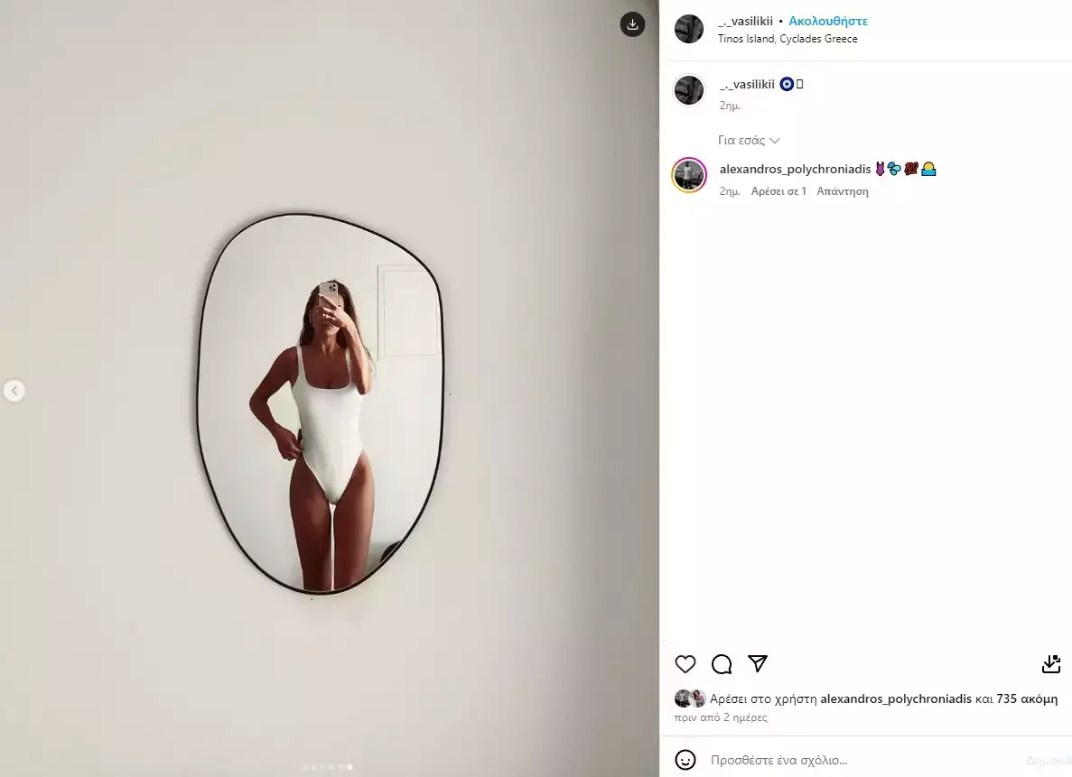 Ο Αλέξανδρος και η Βασιλική έκαναν πρόσφατα κοινές διακοπές στην Τήνο. Η νεαρή Βασιλική δημοσίευσε φωτογραφίες της από το νησί στο Instagram, με τον σύντροφό της να της κάνει φυσικά σχόλιο.