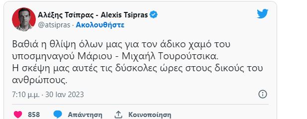 - «Βαθιά η θλίψη όλων μας για τον άδικο χαμό του υποσμηναγού Μάριου – Μιχαήλ Τουρούτσικα», έγραψε χαρακτηριστικά για να συμπληρώσει πως: «Η σκέψη μας αυτές τις δύσκολες ώρες στους δικούς του ανθρώπους», σημείωσε ο πρόεδρος του ΣΥΡΙΖΑ.