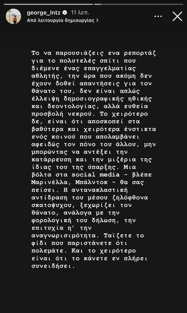 «Το να παρουσιάζεις ένα ρεπορτάζ για το πολυτελές σπίτι που διέμενε ένας επαγγελματίας αθλητής, την ώρα που ακόμη δεν έχουν δοθεί απαντήσεις για το θάνατό του, δεν είναι απλώς έλλειψη δημοσιογραφικής ηθικής και δεοντολογίας, αλλά ευθεία προσβολή νεκρού.