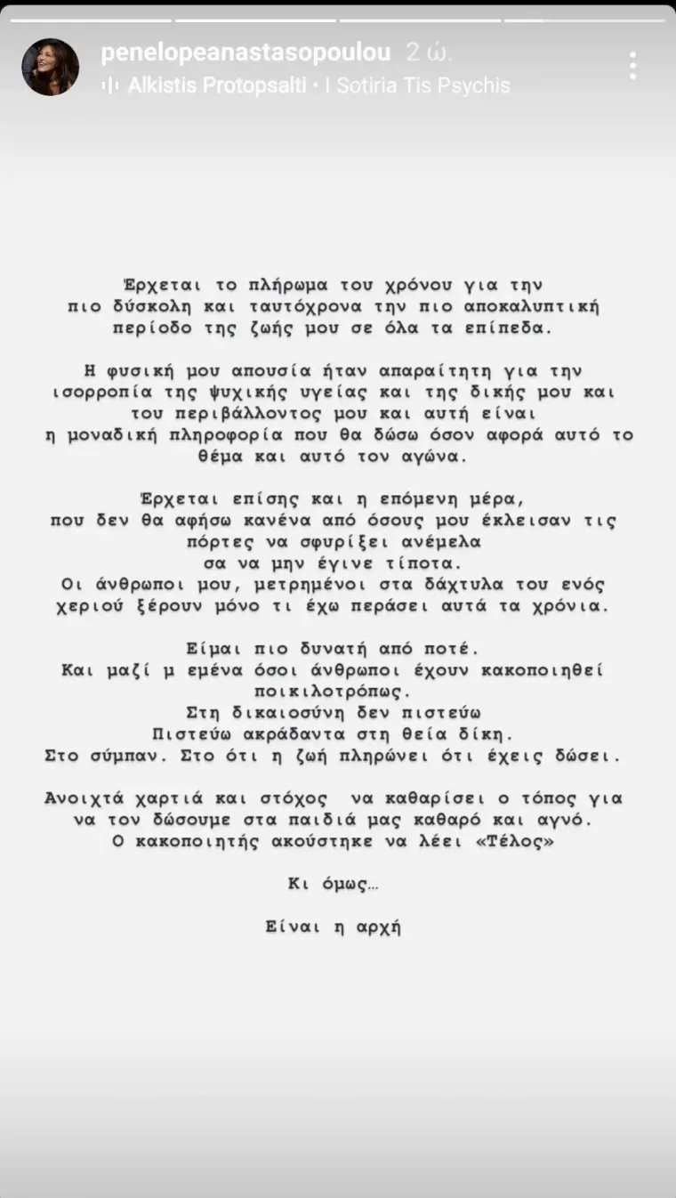 Είμαι πιο δυνατή από ποτέ. Και μαζί μ’ εμένα όσοι άνθρωποι έχουν κακοποιηθεί ποικιλοτρόπως. Στη δικαιοσύνη δεν πιστεύω Πιστεύω ακράδαντα στη θεία δίκη. Στο σύμπαν. Στο ότι η ζωή πληρώνει ότι έχεις δώσει. Ανοιχτά χαρτιά και στόχος να καθαρίσει ο τόπος για να τον δώσουμε στα παιδιά μας καθαρό και αγνό. Ο κακοποιητής ακούστηκε να λέει «Τέλος» Κι όμως… Είναι η αρχή», έγραψε η Πηνελόπη Αναστασοπούλου.