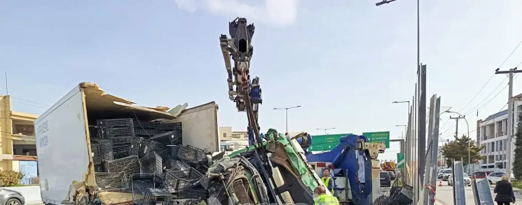 Aπό την ανατροπή της νταλίκας στην Εθνική Οδό έσπασαν τα πλαστικά προστατευτικά.