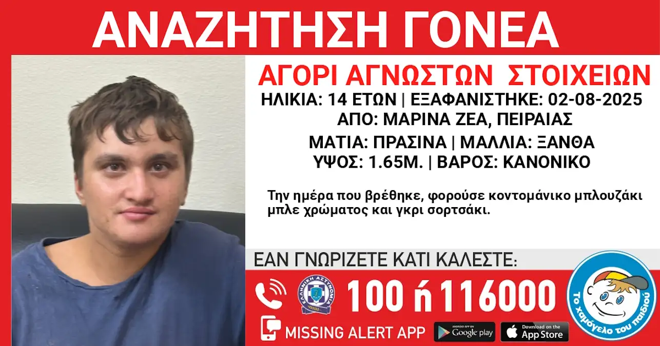 Στη δημοσιότητα δόθηκαν την Κυριακή (03.08.2025) από το «Χαμόγελο του Παιδιού» φωτογραφίες ανήλικου αγοριού, που βρέθηκε να περιπλανιέται χθες το βράδυ ασυνόδευτο, στην περιοχή Μαρίνα Ζέας του Πειραιά.
