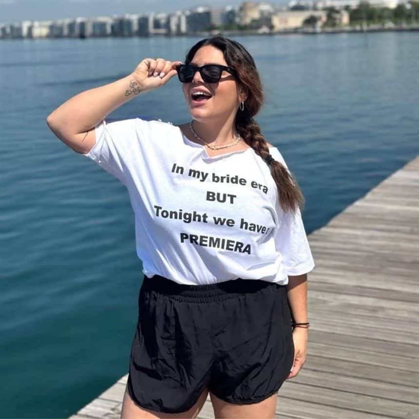 Στις φωτογραφίες που δημοσίευσε εμφανίζεται να φορά μπλούζα με μήνυμα που παραπέμπει ευθέως στη νέα αυτή προσωπική της περίοδο, δίνοντας έτσι την πρώτη δημόσια επιβεβαίωση για τον επικείμενο γάμο. Στη λεζάντα της ανάρτησης συνδύασε τη χαρά της πρεμιέρας με την προσωπική της ευτυχία, αναφερόμενη στην έναρξη των παραστάσεων στη Θεσσαλονίκη και καλώντας το κοινό να βρεθεί κοντά τους τις επόμενες ημέρες.