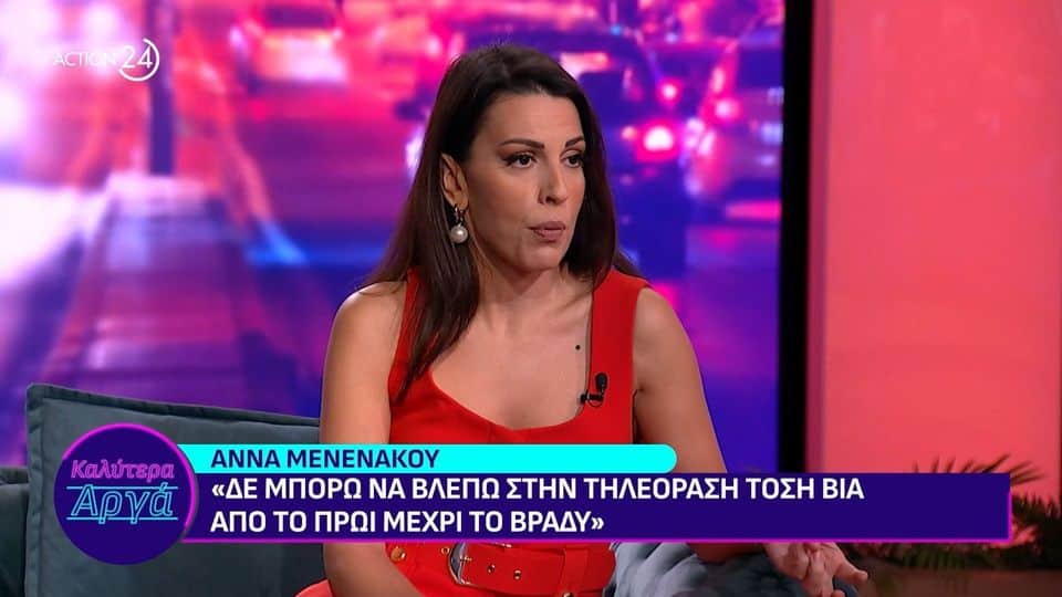 Την Άννα Μενενάκου φιλοξένησε η Αθηναϊς Νέγκα το βράδυ της Τετάρτης στο νέο επεισόδιο της εκπομπής “Καλύτερα αργά” που προβλήθηκε στο πρόγραμμα του Action 24. Μάλιστα, μεταξύ άλλων, η γοητευτική ηθοποιός μίλησε για την τηλεόραση.