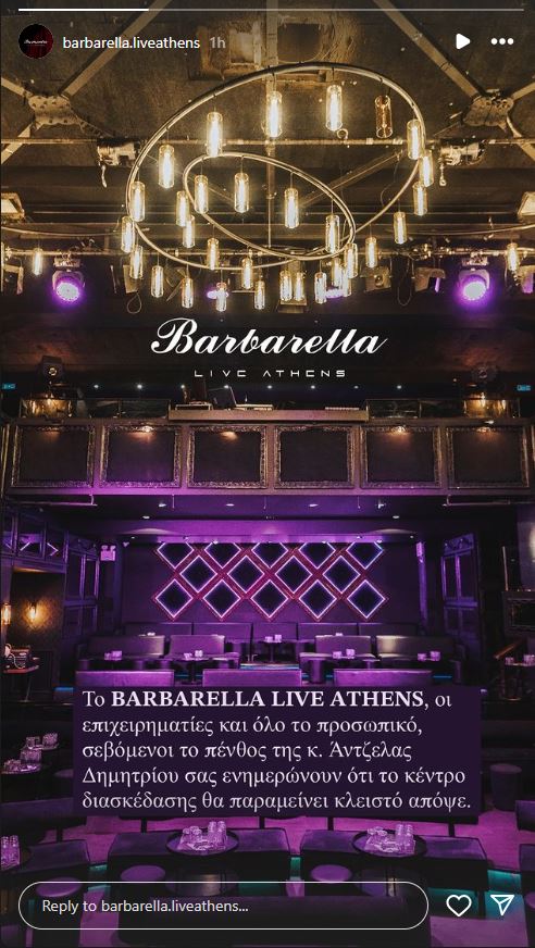 «Το Barbarella Live Athens, οι επιχειρηματίες και όλο το προσωπικό, σεβόμενοι το πένθος της κ. Άντζελας Δημητρίου σας ενημερώνουν ότι το κέντρο διασκέδασης θα παραμείνει κλειστό απόψε», έγραφε η ανακοίνωση του νυχτερινού κέντρου.
