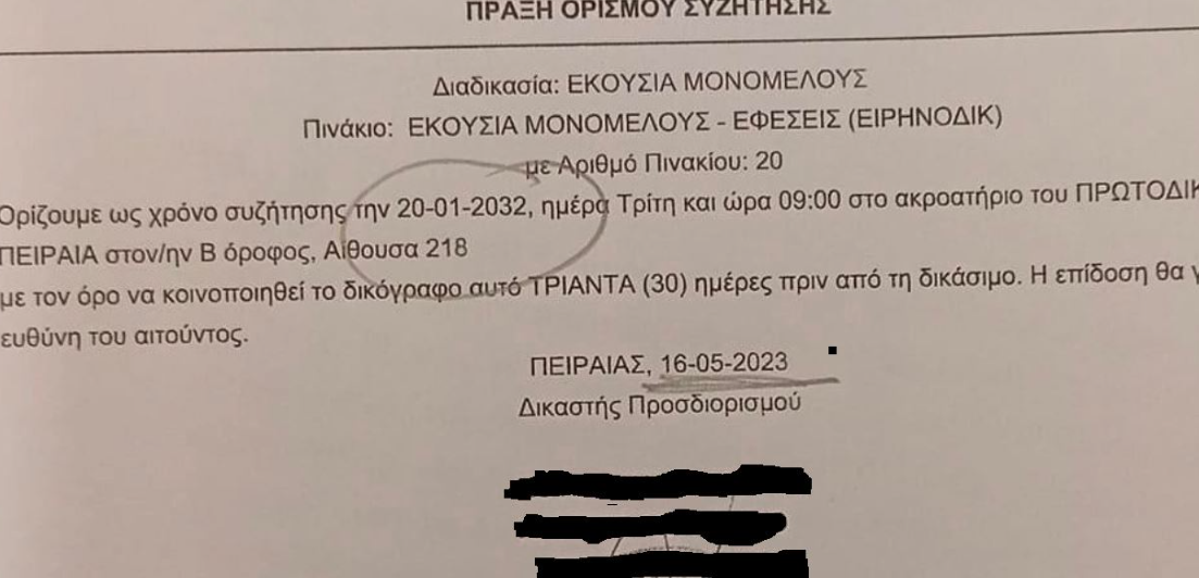 Εννιά χρόνια μετά από την ημερομηνία κατάθεσης του δικογράφου, δηλαδή για το μακρινό (ποιος ζει ποιος πεθαίνει…) 2032, προσδιορίστηκε η δικάσιμος συζήτησης υπόθεσης (εκούσια Μονομελούς) στο Πρωτοδικείο Πειραιά. Η κατάθεση του δικογράφου έγινε 16.5.2023 και η συζήτηση ορίστηκε για τις 20 Ιανουαρίου 2032!