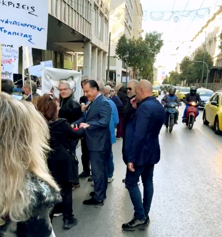 - Πρίν απο λίγο ο κ. Γεωργιάδης κατέβηκε απο το γραφείο του και βρέθηκε στο πεζοδρόμιο ανάμεσα στους υπαλλήλους της εμπορικής Τράπεζας που διαμαρτυρόταν για δυο μεγάλες εκρεμμότητες τους.