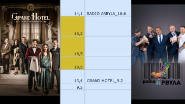 Ένα ακόμη κακό βράδυ για τον Αντ1. Μια ακόμη μαύρη τρύπα. Το “Grand Hotel” πήρε πάσα απο τους Αρβύλα στο 22% και “κατάφερε” να πέσει στο 8%. Μεγάλο πρόβλημα για το κανάλι του Αμαρουσίου που βλέπει την ακριβότερη παραγωγή του να πέφτει στο κενό.