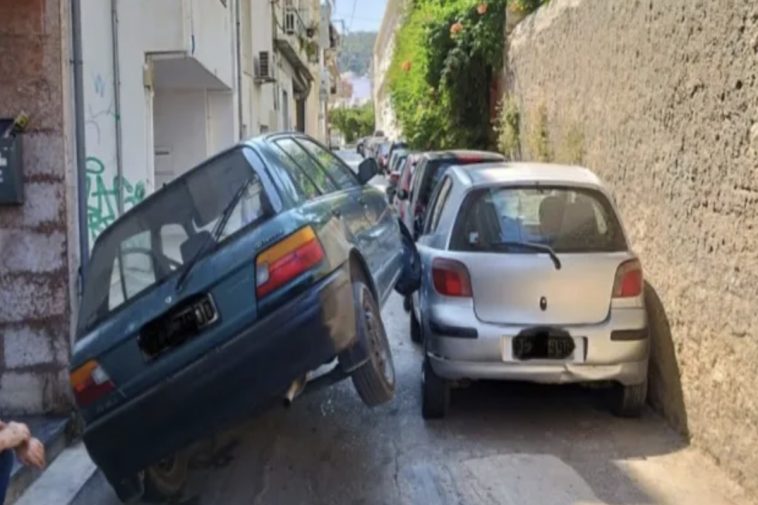 Σύμφωνα με τον ιστότοπο rethemnosnews, ο οδηγός προσπάθησε να περάσει από την στενή οδό και κατάληξε να «καβαλήσει» με το αυτοκίνητο του πάνω σε άλλο σταθμευμένο όχημα. Ευτυχώς δεν τραυματίστηκε κανένας και επενέβη η Τροχαία με την κυκλοφορία να σταματά μέχρι να απεγκλωβίζεται το ένα όχημα πάνω από το άλλο.