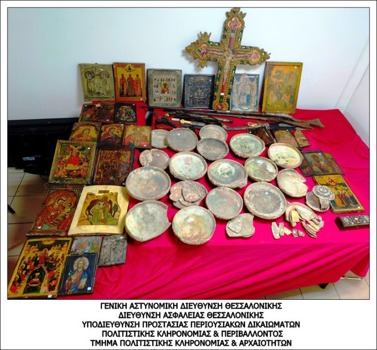 Έναν σημαντικό αρχαιολογικό θησαυρό έκρυβε στα σπίτια της αλλά και στον εργασιακό της χώρο μια 70χρονη γυναίκα στη Θεσσαλονίκη που συνελήφθη από τις αρχές. Σπαθιά, καριοφίλια, πιστόλες, θρησκευτικές εικόνες, γιαταγάνι, σταυρό τέμπλου και πολλά ακόμη αρχαία αντικείμενα κατείχε η ηλικιωμένη γυναίκα που χρησιμοποιούσε ως κρυψώνες. Σε βάρος της 70χρονης σχηματίσθηκε δικογραφία για παράβαση της Νομοθεσίας που αφορά σε «Κύρωση κώδικα νομοθεσίας για την Προστασία των Αρχαιοτήτων και εν γένει της πολιτιστικής κληρονομιάς» και της Νομοθεσίας «Περί Όπλων». Η ανακοίνωση της Γενικής Αστυνομικής Διεύθυνσης Θεσσαλονίκης αναφέρει:Η κατάλληλη αξιοποίηση πληροφοριών από αστυνομικούς του Τμήματος Πολιτιστικής Κληρονομιάς και Αρχαιοτήτων της Διεύθυνσης Ασφάλειας Θεσσαλονίκης, οδήγησε στη σύλληψη 70χρονης ημεδαπής, σε βάρος της οποίας σχηματίσθηκε δικογραφία για παράβαση της Νομοθεσίας που αφορά σε «Κύρωση κώδικα νομοθεσίας για την Προστασία των Αρχαιοτήτων και εν γένει της πολιτιστικής κληρονομιάς» και της Νομοθεσίας «Περί Όπλων».