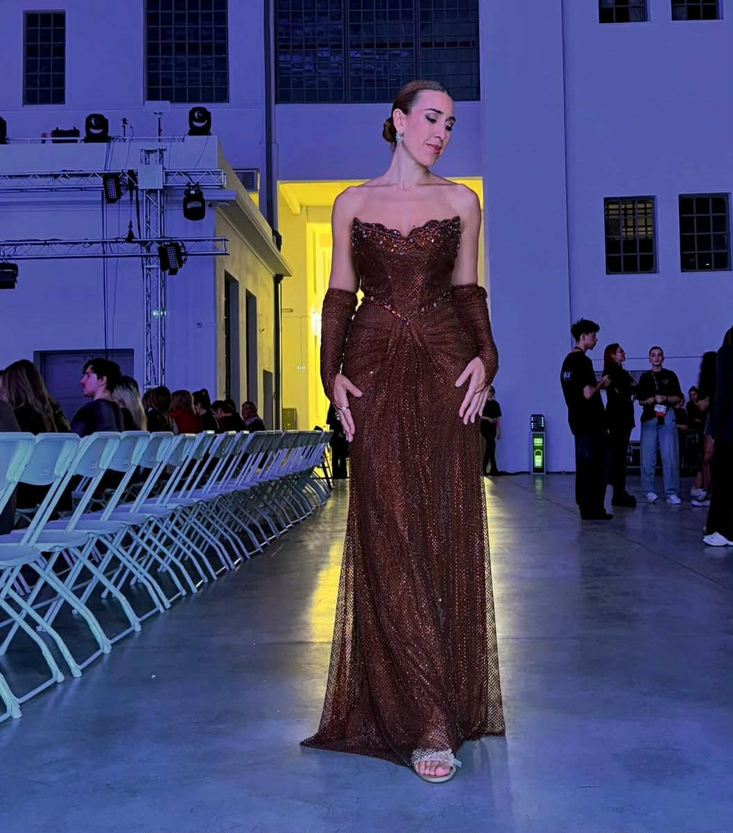 - Με ύψος και αναλογίες μοντέλου, εμφανίστηκε με μια εντυπωσιακή δημιουργία της σχεδιάστριας, πραγματοποιώντας την πρώτη της επαγγελματική εμφάνιση σε πασαρέλα έπειτα από προσωπική πρόσκληση της δημιουργού.