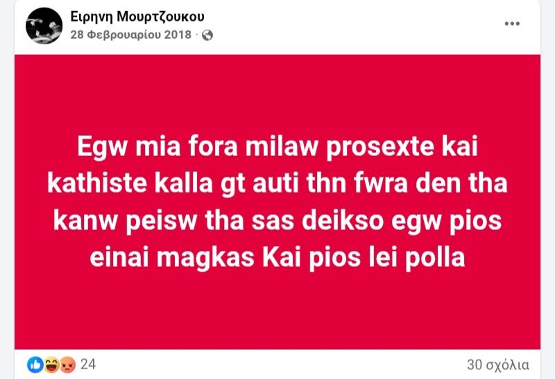 Στο Facebook, η πρώτη από αυτές, ήταν τον Οκτώβριο του 2017, όπου ζητούσε να μείνουν μακριά από κάποιους δικούς της, απειλώντας τους με χυδαία λόγια. Στην δεύτερη, τον Φεβρουάριο του 2018, έλεγε σε κάποιους να κάτσουν “καλά”, γιατί αλλιώς θα τους δείξει “ποιος είναι μάγκας”και”ποιος λέει πολλά”.