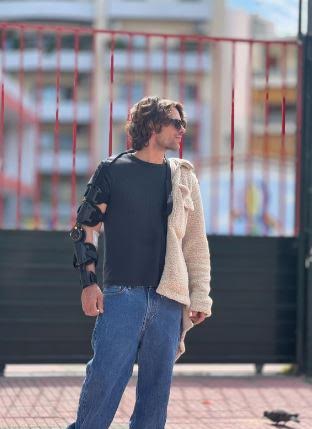 Δείχνοντας τον νάρθηκα που φέρει στο δεξί πονεμένο χέρι του. Παράλληλα ευχαρίστησε τον γιατρό του και δέχτηκε πολλές ευχές για ανάρρωση.