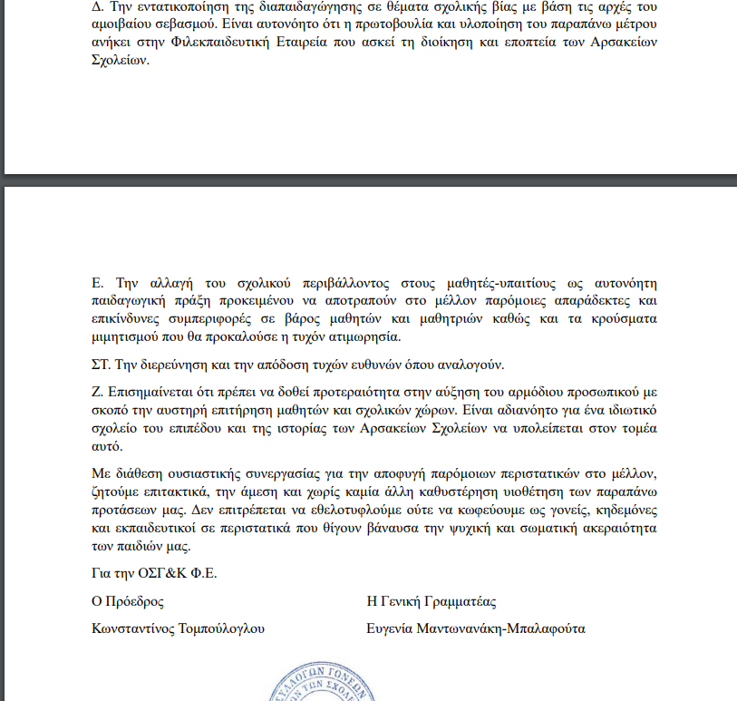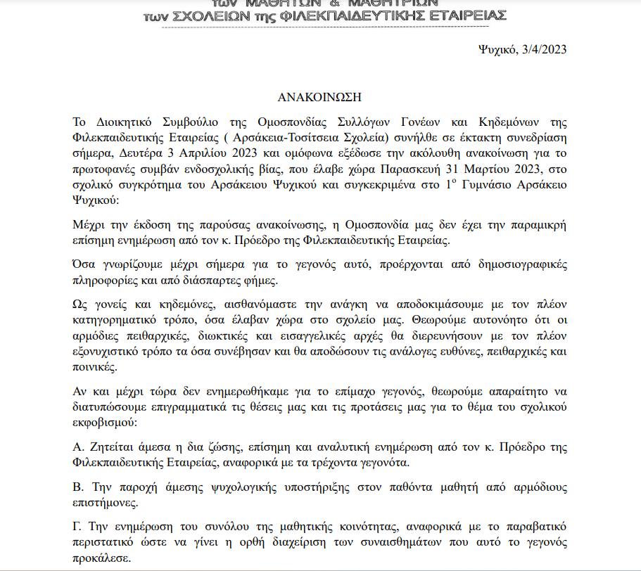 Ο σύλλογος Γονέων και Κηδεμόνων των σχολείων Αρσακείου μετά το περιστατικό bullying ζητούν τη ψυχολογική στήριξη του θύματος και να αποβληθούν οι θύτες.