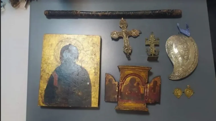 - Οι αστυνομικοί εντόπισαν την κατοικία του 73χρονου Έλληνα στην περιοχή της Ηλιούπολης και έκαναν έρευνα, κατά την διάρκεια της οποίας βρήκαν συνολικά 34 νομίσματα διαφόρων περιόδων, πέντε ξύλινες εικόνες αγίων, δυο λειτουργικά άμφια, δυο μεταλλικούς σταυρούς και ένα εγκόλπιο, τα οποία εμπίπτουν στις προστατευτικές διατάξεις της νομοθεσίας.