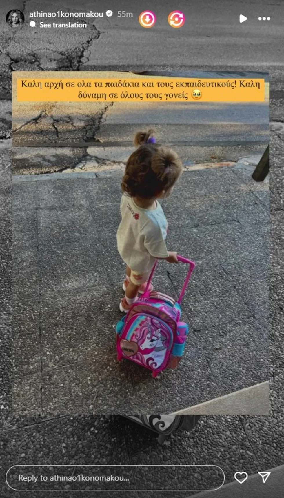 Μάλιστα, η Αθηνά Οικονομάκου πήγε την μικρή της, Σιέννα στον παιδικό σταθμό και την απαθανάτισε να κρατά την τσάντα της και σχολίασε: «Καλή αρχή σε όλα τα παιδάκια και τους εκπαιδευτικούς! Καλή δύναμη σε όλους τους γονείς»