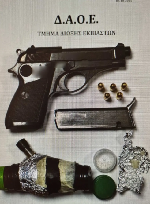 Συγκεκριμένα, όπως ανακοινώθηκε από την ΕΛ.ΑΣ., στο πλαίσιο ελέγχων, που πραγματοποιούνταν από κλιμάκιο αστυνομικών του Τμήματος Δίωξης Εκβιαστών σε καταστήματα υγειονομικού ενδιαφέροντος στην ευρύτερη περιοχή της Αττικής, ο κατηγορούμενος εντοπίστηκε κατά την έξοδό του από νυχτερινό κέντρο διασκέδασης και σε σωματικό έλεγχο, που του ασκήθηκε, εντοπίστηκαν στην κατοχή του και κατασχέθηκαν: