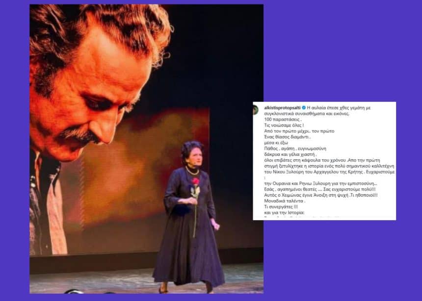 Με έντονα συναισθήματα έπεσε η αυλαία της παράστασης για τον Νίκο Ξυλούρη, με την Άλκηστις Πρωτοψάλτη να λέει το δικό της αντίο μετά από μια επιτυχημένη διαδρομή. Η ίδια δεν θα ακολουθήσει την περιοδεία, λόγω επαγγελματικών υποχρεώσεων, ενώ τη θέση της παίρνει η Μελίνα Κανά.