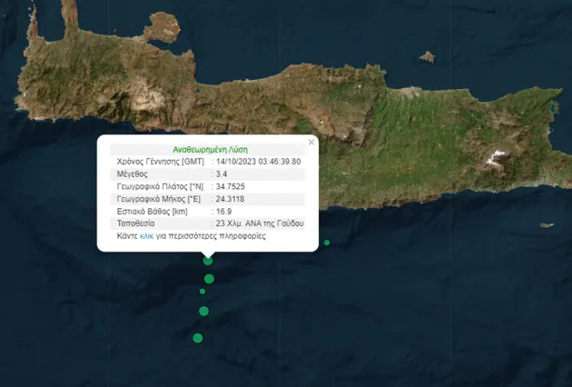 Μπαράζ σεισμικών δονήσεων καταγράφηκε τα ξημερώματα του Σαββάτου 14 Οκτωβρίου, στο θαλάσσιο χώρο νότια της Κρήτης με διαφορά περίπου μια ώρα, με τον κυριότερο να φτάνει τα 3,8 Ρίχτερ.Ο πρώτος σεισμός 3,4 βαθμών της κλίμακας Ρίχτερ σημειώθηκε 23 χιλιόμετρα ανατολικά νοτιοανατολικά της Γαύδου, ενώ το εστιακό του βάθος υπολογίζεται στα 16,9 χιλιόμετρα.