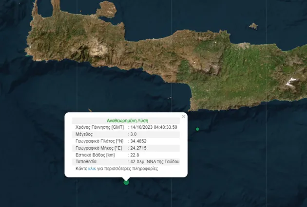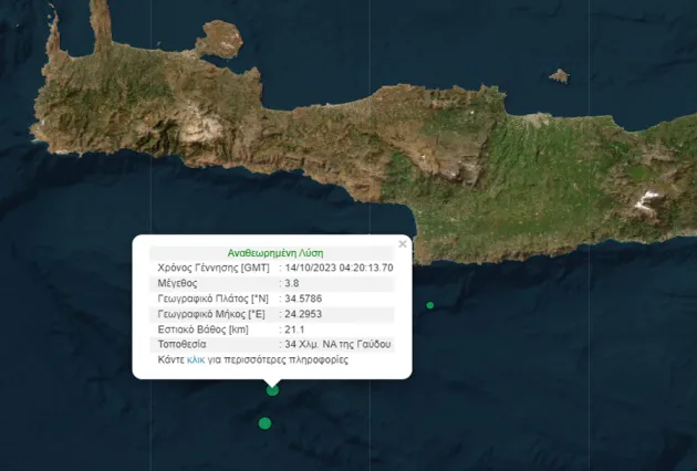 Μπαράζ σεισμικών δονήσεων καταγράφηκε τα ξημερώματα του Σαββάτου 14 Οκτωβρίου, στο θαλάσσιο χώρο νότια της Κρήτης με διαφορά περίπου μια ώρα, με τον κυριότερο να φτάνει τα 3,8 Ρίχτερ.Ο πρώτος σεισμός 3,4 βαθμών της κλίμακας Ρίχτερ σημειώθηκε 23 χιλιόμετρα ανατολικά νοτιοανατολικά της Γαύδου, ενώ το εστιακό του βάθος υπολογίζεται στα 16,9 χιλιόμετρα.