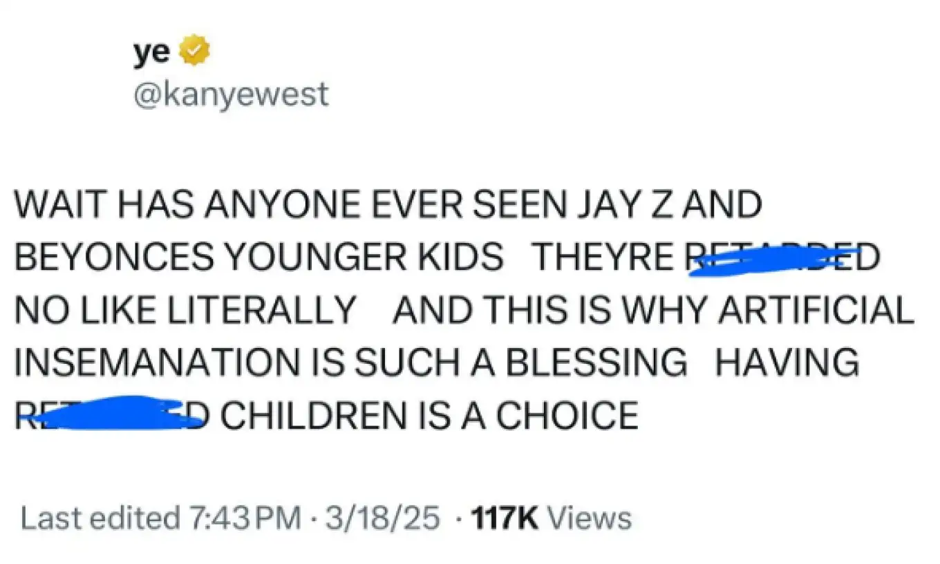 «Περιμένετε, έχει δει ποτέ κανείς τα μικρότερα παιδιά του Jay-Z και της Μπιγιονσέ; Είναι ”καθυστερημένα”. Όχι, κυριολεκτικά, και γι’ αυτό η τεχνητή γονιμοποίηση είναι ευλογία, το να έχεις ”καθυστερημένα” παιδιά είναι επιλογή», έγραψε συγκεκριμένα στην ανάρτησή του ο Kanye West για τα παιδιά της Beyone και του Zay-Z.