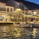 Νυχτερινά γυρίσματα πραγματοποιήθηκαν την Παρασκευή στην Ύδρα, με την τεχνητή βροχή να δημιουργεί μια εντυπωσιακή ατμόσφαιρα στο λιμάνι.