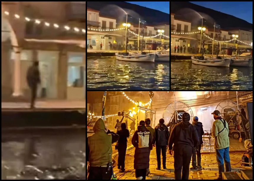 Νυχτερινά γυρίσματα πραγματοποιήθηκαν την Παρασκευή στην Ύδρα, με την τεχνητή βροχή να δημιουργεί μια εντυπωσιακή ατμόσφαιρα στο λιμάνι.