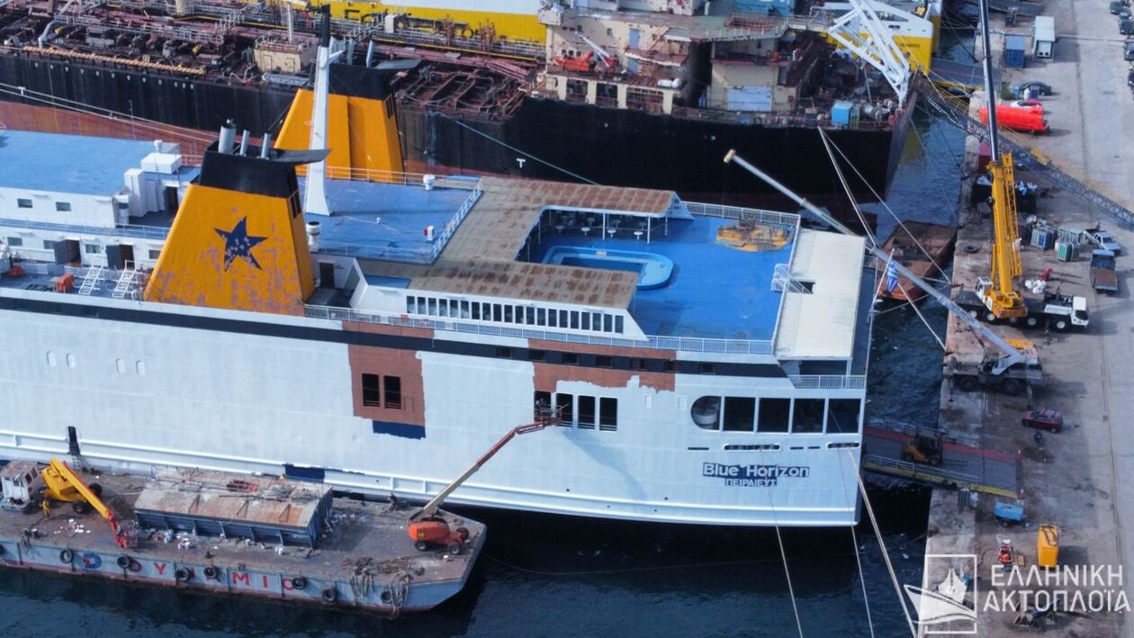 Στη Ναυπηγοεπισκευαστική Ζώνη του Περάματος παραμένει δεμένο το πλοίο Blue Horizon, στο οποίο βρήκε τραγικό θάνατο ο 36χρονος Αντώνης Καργιώτης από την εγκληματική συμπεριφορά μελών του πληρώματος.Στο πλοίο συνεχίζονται οι εργασίες επισκευής και έχει αρχίσει να βάφεται σε λευκό χρώμα, ενισχύοντας τις φήμες που θέλουν το πλοίο να αλλάζει όνομα αλλά και εταιρεία.Σύμφωνα με τις εικόνες που δημοσίευσε το ellinikiaktoploia, όλα τα διακριτικά στοιχεία της «Blue Star» και τα σήματα της εταιρείας έχουν καλυφθεί από χρώμα.