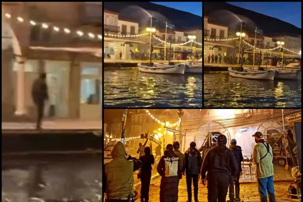 Νυχτερινά γυρίσματα πραγματοποιήθηκαν την Παρασκευή στην Ύδρα, με την τεχνητή βροχή να δημιουργεί μια…