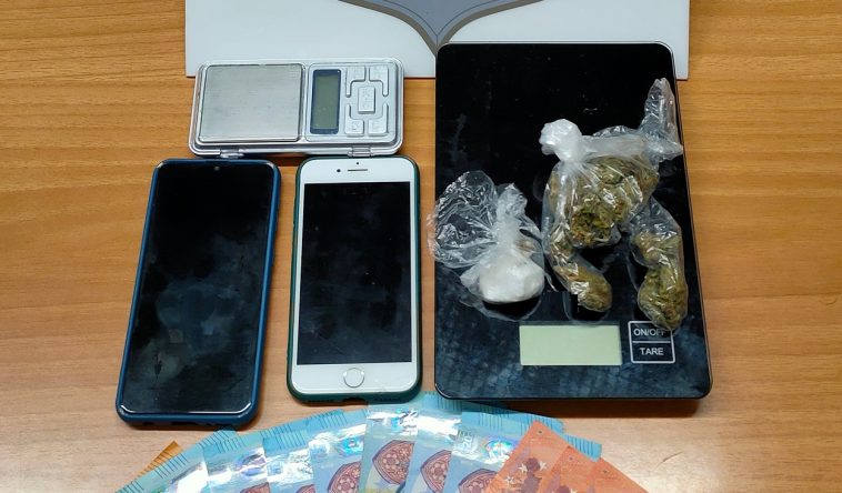 Στην κατοχή του και στην οικία του, βρέθηκαν και κατασχέθηκαν, 5,3 γραμμάρια κοκαΐνη, 8,7 γραμμάρια κάνναβη, 2 ηλεκτρονικές ζυγαριές ακριβείας, 2 κινητά τηλέφωνα και χρηματικό ποσό 300 ευρώ.