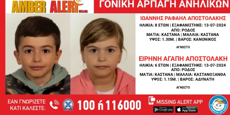 Συναγερμός έχει σημάνει στις αστυνομικές αρχές της Ρόδου μετά την εξαφάνιση δύο παιδιών ηλικίας 6 και 8 ετών, σύμφωνα με το Χαμόγελο του Παιδιού που εξέδωσε Amber Alert.