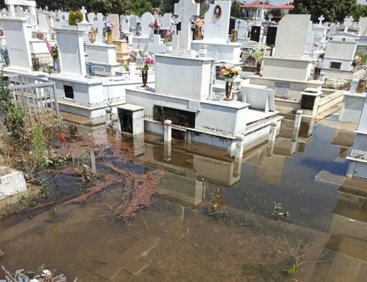 Η κακοκαιρία Daniel προκάλεσε μεγάλες καταστροφές στο νεκροταφείο της Αγίας Παρασκευής στη βόρεια πλευρά της Λαμίας.