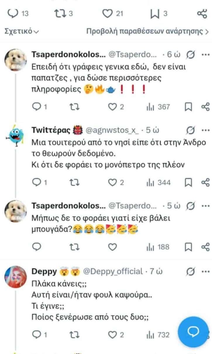 Η νέα φημολογία έφερε διάφορα σχόλια χρηστών της πλατφόρμας, τα οποία υποστηρίζουν ότι η κατάσταση ανάμεσα στο ζευγάρι δεν είναι η ίδια όπως στο παρελθόν. Μάλιστα, σε αρκετές αναρτήσεις γίνεται αναφορά στο νησί της Άνδρου, όπου η οικογένεια περνά μεγάλο μέρος του χρόνου της, με ορισμένους να γράφουν χαρακτηριστικά: «Το γνωρίζει όλη η Άνδρος».