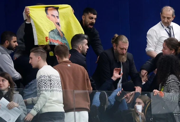 - Οι συγκεντρωθέντες κρατούσαν σημαίες και πανό με το πρόσωπο του Οτσαλάν και ανέβηκαν στον εξώστη της αίθουσας, προκαλώντας αναστάτωση.