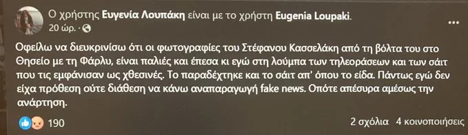 - Επειδή η Τετάρτη 6 Δεκεμβρίου ήταν ημέρα πυκνών εξελίξεων, καθώς στη Βουλή συζητούνταν το φορολογικό νομοσχέδιο, ενώ στους δρόμους οργανώνονταν διαδηλώσεις, αφού ήταν η επέτειος από τη δολοφονία του Αλέξανδρου Γρηγορόπουλου και ο πρόεδρος του ΣΥΡΙΖΑ εμφανιζόταν να βγάζει αμέριμνος βόλτα τον σκύλο του, η εικόνα και το σχόλιο της κ. Λουπάκη χτύπησαν άσχημα στο μάτι.Όμως η βόλτα είχε γίνει, υποτίθεται, τουλάχιστον προ εικοσαημέρου και σε πολιτικό χρόνο ουδέτερο, κάτι που αφαιρεί από το γεγονός οποιαδήποτε περαιτέρω πολιτική ερμηνεία.H ίδια η δημοσιογράφος, μετά τις εξελίξεις στο Κόκκινο, απέσυρε την ανάρτησή της και αναγκάστηκε να προβεί σε απολογία:«Οφείλω να διευκρινίσω ότι οι φωτογραφίες του Στέφανου Κασσελάκη από τη βόλτα του στο Θησείο με τη Φάρλυ, είναι παλιές και έπεσα κι εγώ στη λούμπα των τηλεοράσεων και των σάιτ που τις εμφάνισαν ως χθεσινές. Το παραδέχτηκε και το σάιτ απ’όπου το είδα. Πάντως εγώ δεν είχα πρόθεση ούτε διάθεση να κάνω αναπαραγωγή fake news. Οπότε απέσυρα αμέσως την ανάρτηση», έγραψε.Ήταν το δεύτερο «χτύπημα» της κ. Λουπάκη, η οποία είχε βρεθεί και πριν λίγες μόλις ημέρες στο μάτι του κυκλώνα από τους λεγόμενους «κασσελίστας» του Διαδικτύου με επικεφαλής τους τον Νίκο Μωραΐτη, όταν είχε ανεβάσει χωρίς σχόλιο εκείνη τη φορά μια συνέντευξη της «αποστάτριας» Έφης Αχτσιόγλου.