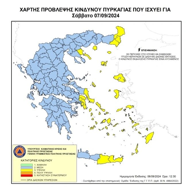 Υψηλός κίνδυνος για πρόκληση φωτιάς σε δεκατρείς περιοχές της ελληνικής επικράτειας, υπάρχει σύμφωνα με τον χάρτη πρόβλεψης κινδύνου πυρκαγιάς του υπουργείου Πολιτικής Προστασίας και Κλιματικής Κρίσης, για , Σάββατο (7/9)